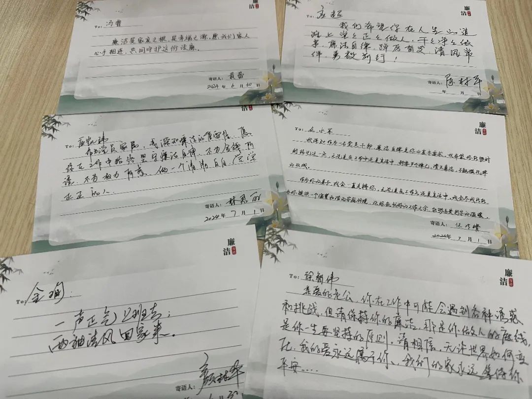 為充分發揮家庭促廉助廉作用,近期,五金城集團黨委組織開展了家屬廉潔寄語活動,邀請集團二級中層以上干部職工家屬在廉潔寄語卡上寫下對家人的“廉潔寄語”,共收到59份廉潔寄語。一封封“廉潔寄語”,字字珠璣、春風化雨,傳遞了干部職工家屬們廉潔齊家的深厚期許,進一步筑牢家庭腐敗“防火墻”,提醒黨員干部過好家庭關、親情關,營造崇廉尚廉愛廉倡廉的濃厚氛圍。
